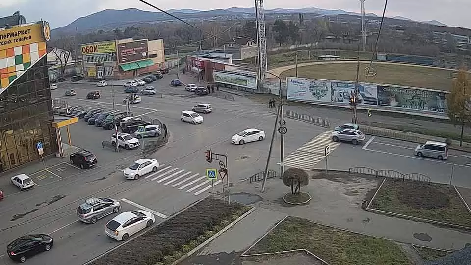 Die Webcam an der Kreuzung der Straßen Ostrowskogo und Schukowskogo in Arsenjew überträgt in Echtzeit die Verkehrssituation und das alltägliche Stadtleben. Im Bild erscheinen Autos, Fußgänger und umliegende Gebäude.