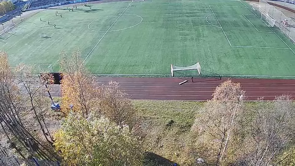 The webcam installed at the City Stadium in Apatity broadcasts the sports arena and its atmosphere in real time. The view shows the football field, running tracks, stands, and the surrounding area.